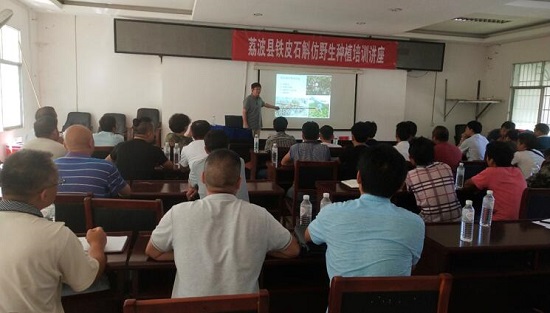 考察期间,荔波县科技产权局、农村工作局以及林业局在荔波县小七孔镇和荔波县瑶山瑶族乡联合举办了两场“铁皮石斛仿野生种植技术”培训班,参加培训的石斛种植户达100余人,培训采取专题讲座和现场讲解指导相结合的方式进行。段博士对石斛仿野生种植基地选址、种苗选择、仿野生种植方式、肥水管理和病虫害防治等方面进行详细讲解,获得良好的传播效果。