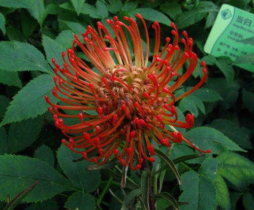 针垫花(Leucospermum sp.)又名风轮花、针包花、针垫山龙眼等,属于山龙眼科针垫花属(Leucospermum)植物。全属植物约50多种,主要分布在南非和津巴布韦等地。常绿蔓性灌木,少数为小乔木,叶轮生,硬质,多为针状、心脏形或矛尖状,边缘或叶尖有锯齿;花序密集,头状花序,单生或少数聚生;花冠小,针状。从它的植物学特征的描述可以看出这种植物有些古老和原始。确实,针垫花是南非本土的植物品种,生长在酸性、贫瘠的土壤环境中,在冬季多雨季节和炎热、干燥的夏季开花。据说,在南非开普角保护区还遗存有世界上为数不多的金黄色针垫花,成为植物王国里不可多得的活化石。如今的针垫花是通过众多的鲜花布景被世界各地的游人认识,从而走出国门,并分布于世界的每一个角落,成为一个非常流行的园艺品种,也被广泛用作鲜切花。