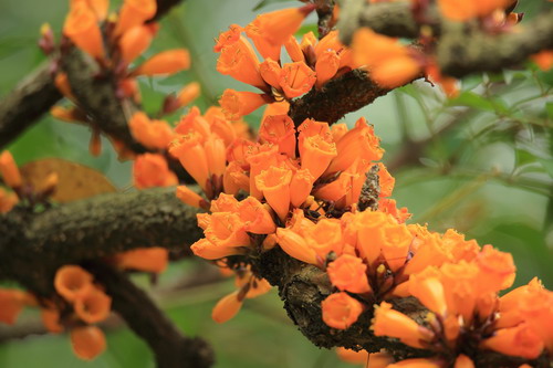 漫步在春光灿烂的华南植物园,不经意间放眼望去黑炭般的树干上一簇簇、一丛丛、一团团橙黄色至金黄色的花仿佛熊熊燃烧的野火,微风吹过,悉悉索索繁花纷飞而下,蔚为壮观。它就是火烧花,先开花,后发叶,一种典型的老茎生花植物。