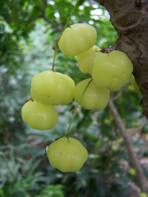 西印度醋栗(Phyllanthus acidus (Linn.) Skeel)是大戟科叶下珠属常绿灌木或小乔木,树高2-5米,夏至秋季开花,花后座果率较高,成熟果实扁球形,具凸稜,淡黄绿色,可食用,生食口感爽脆, 水分多,但味酸,主要用于制造果酱、果汁、或是醃漬后食用,原产地是马达加斯加岛。