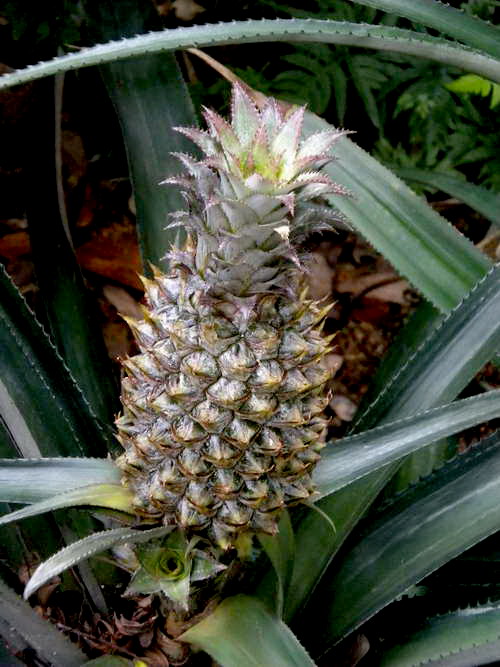菠萝(Ananas comosus (L.) Merr.),别名凤梨。有些人会以为菠萝硕大的果实是挂在高大的树上,其实菠萝是凤梨科(Bromeliaceae)凤梨属的多年生单子叶常绿草本,高0.5-1.5m,无主根,具纤维质须根系;肉质茎,叶片螺旋着生,叶剑形,叶背面的气孔和茸毛有贮存CO2的特殊结构,能阻止水分蒸发,故耐旱。但不耐寒,5℃是受冻的临界温度,43℃高温即停止生长。穗状花序自叶丛中抽生,在自然界里,由蜂鸟帮其进行授粉,也有些野生菠萝通过蝙蝠授粉。我们见到的菠萝果实,其实不是“一个”果实,而是由多朵小花结成的多个肉质小果实组合而成,即复合果,外形呈圆筒形,果肉黄色。