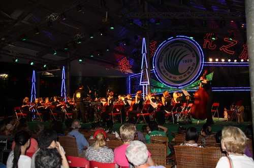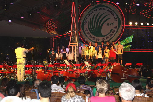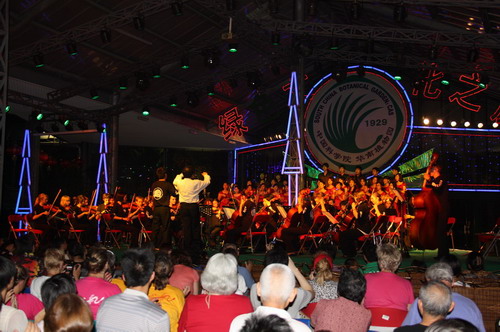 璀璨的灯光下,温室群景区光芒四射,远远望去犹如一颗璀璨的明珠,映衬着夜空格外闪亮。6月5日晚,别具一格的音乐会——中美文化艺术交流暨2010年华南植物园夏季森林音乐会在热带雨林室广场隆重举行。