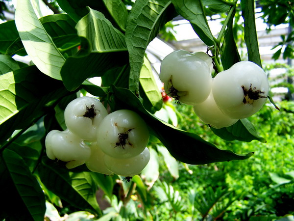 莲雾(Syzygium sp.)又名洋蒲桃,是桃金娘科常绿小乔木,树高5~15米,树冠圆形。原产马来半岛、安达曼群岛,是著名的热带水果。果实呈钟形或梨形,果肉海绵状,多汁,略有香气,味道清甜爽口,是夏季优良的清热消暑佳果。开花有香味,果形美,挂果期长,是优良的热带水果和美丽的园林观果树种。