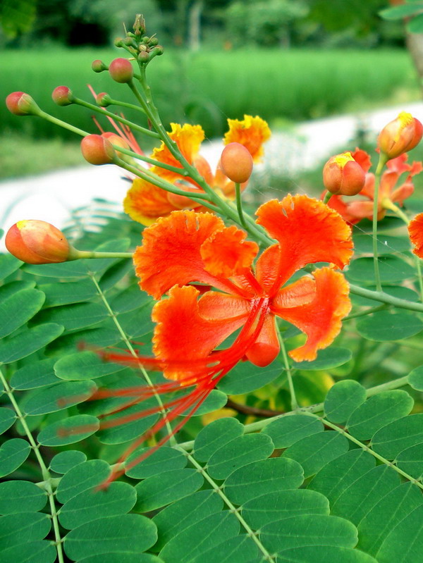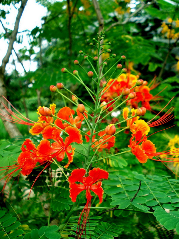 在华南植物园的生物园里,洋金凤花开的正艳,树形轻盈婀娜,优美动人。在阳光的照射下,鲜红色或橙黄色的花儿交相辉映,像传说中的火凤凰在林间飞舞。