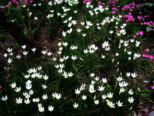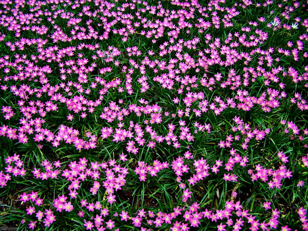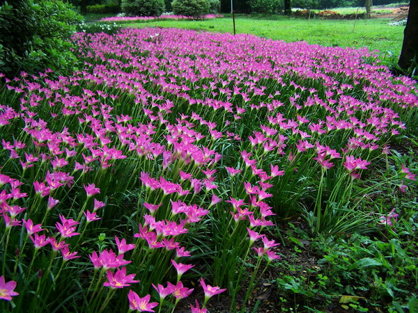 风雨花Zephyranthes grndiflora Lindl.是石蒜科玉帘属多年生草本植物,植株具地下鳞茎,叶线形,外观象韭菜,花较大,喇叭状,形似水仙,成年植株每个鳞茎都能开花,虽然花形较普通,但园林上常成片种植形成地被,盛花时红艳艳开成一片,观赏性很强。原产中、南美洲,现全国各地公园、庭园常有栽培。