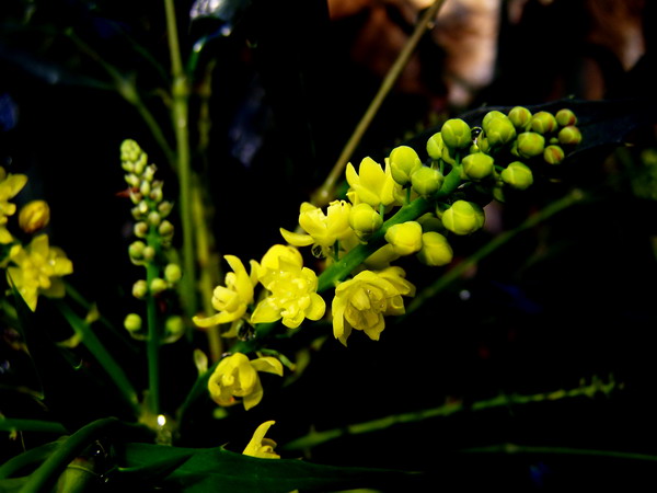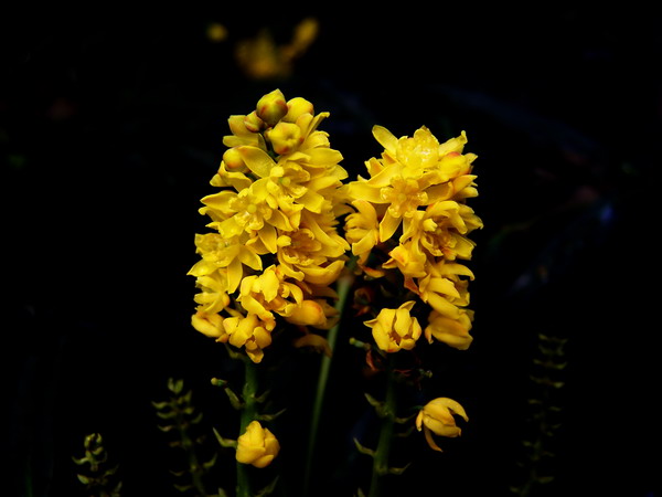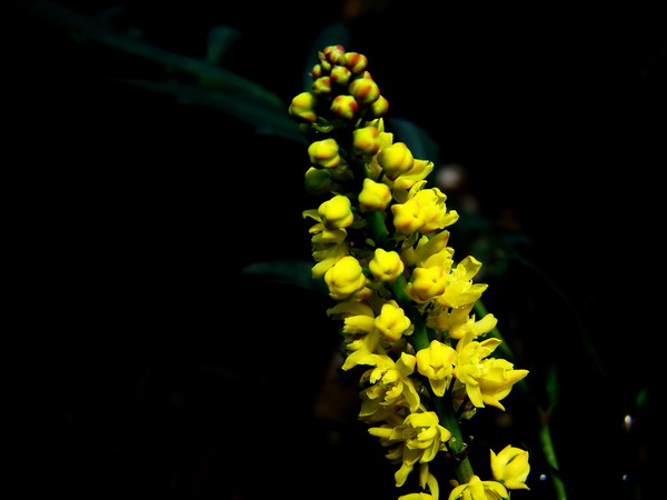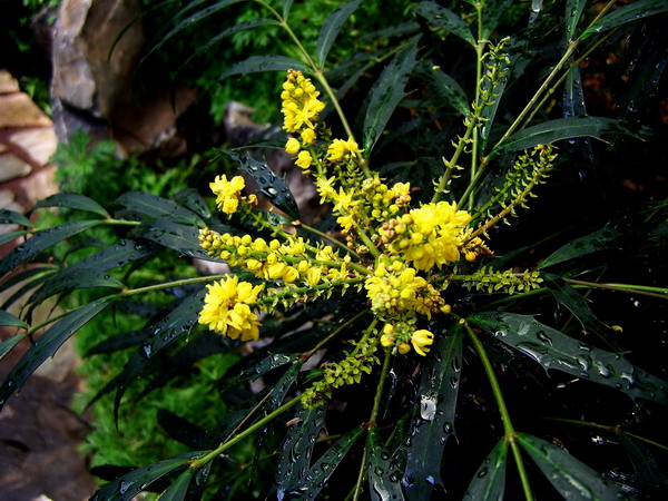湖北十大功劳(Mahonia confusa Sprague)别名土黄连、八角刺、黄天竹,是小檗科十大功劳属常绿灌木,高2-4米,多生于山坡及灌木丛中。羽状复叶互生,富于光泽,叶缘有锯齿如刺,奇巧雅致。常在夏季开一簇簇黄色的小花,鲜艳光亮,非常引人注目。花后结小果如鱼子,果实成熟时紫色,颇为美观,是鸟类喜爱的食物。