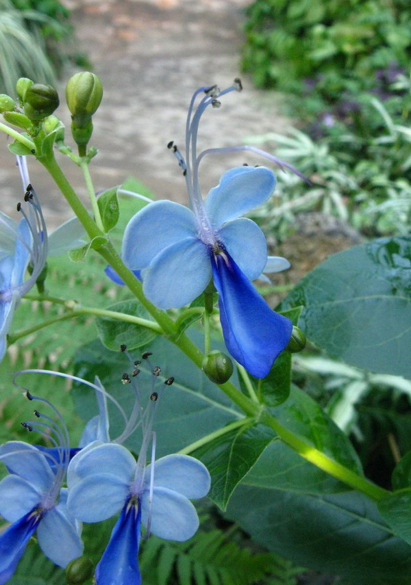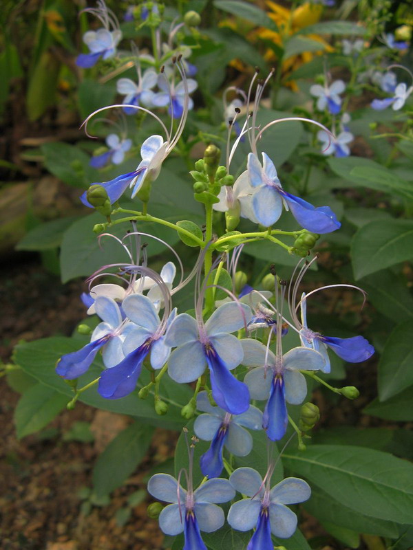 蓝蝴蝶(Clerodendrum ugandense)马鞭草科(Verbenaceae)桢桐属小型常绿灌木,原产于非洲乌干达所以也称其为乌干达桢桐。虽然跟龙吐珠、艳桢桐、垂茉莉是同属兄弟,但其花型、花色却大相迳庭。花冠蓝白色,唇瓣蓝紫色,花瓣完全平展。杯形花萼5裂,裂片圆形,绿带紫色。有4条细长向前直出弯曲的花丝,为紫或白色,非常别致。盛开时花朵的造型酷似蝴蝶翩翩起舞,花姿非常优雅,极富观赏性。