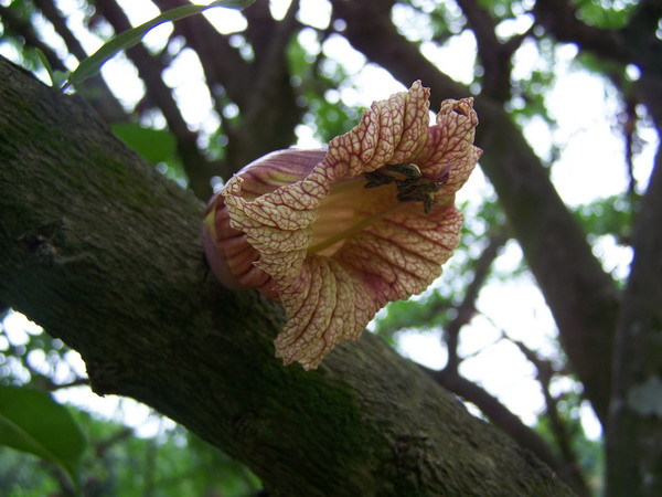 叉叶木(Crescentia alata H.B.K)是紫葳科常绿小乔木,株高3-6m,株型美丽;叶簇生于小枝上,小叶3枚,三叉状生长,形状像十字架,也叫十字架树;花单朵聚生于树干上,近无柄,花冠佛焰苞状,具紫褐色斑纹,花期10-12月,观果期可长达数月,原产南美热带地区,我国广东、云南等省有栽培,是值得推广种植物的优良观果园林树种