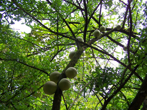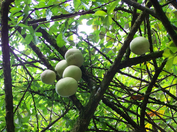 叉叶木挂果的时候很吸引人,硕大的果实直接挂在粗壮的树干上,常常见到三、四个,有时十多个球型的大果一溜排在树身上,煞是好看。果实青绿色,小西瓜大小,表,光滑、青嫩粉白,果皮向光的一面还透出淡淡的粉红色,很像小朋友害羞时泛红的小脸。叉叶木是典型的老茎生花植物,花紫色,开在树干上,在茂密的热带雨林中叉叶木属中下层树种,树干上开花,有利于昆虫传粉,可以躲过狂风暴雨的袭击,强壮的树干也能承受巨大果实的重压,这是植物适应生长环境的一种有趣现象