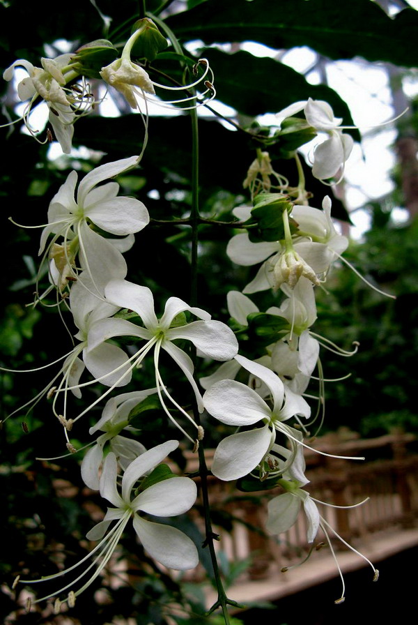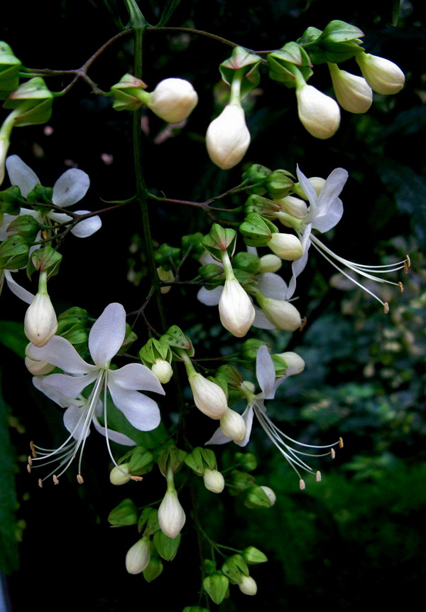 垂茉莉马鞭草科(Verbenaceae)大青属常绿灌木,植株高可达1—2m,小枝棱形,叶对生,披针形,长达10-25cm。白色花瓣5枚,下垂,花丝细长,花朵形似白蝶,枝条纤细,花姿飘逸,盛开时花香扑鼻,故名垂(枝)茉莉。花期为秋天至春天,果期为春夏之际。果成熟时,花蕚会由鲜红色转为紫红色,衬托着紫黑色的果实,有“黑叶龙吐珠”之称。