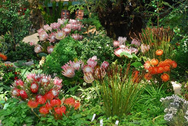 华南植物园展出的帝王花均由南非空运而来,有“皇后”、“帝王”、“金粉”、“火焰”、“红珊瑚”、“圆玫瑰”等14个品种约3000余株打造出华丽的花花世界。
