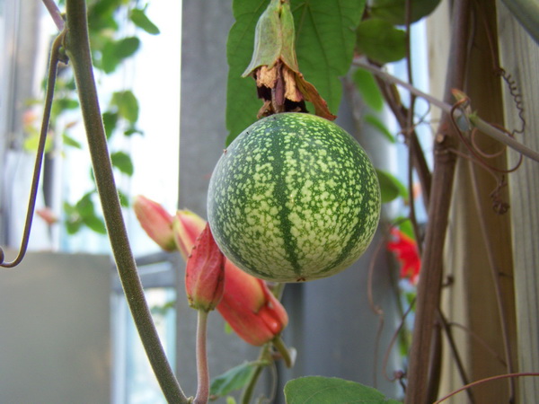 原产南美的洋红西番莲落户华南植物园的奇花异果温室近三年了,年年花开不断,纤细的藤蔓上挂满了花蕾,绽放鲜红色花朵,花呈放射状,极富层次感。今年国庆过后洋红西番莲第一次结了两个小果,在小小果实的点缀下,更具美趣。果实现在约有三华李大小,圆球形,颜色像小南瓜,青嫩光亮,非常可爱。