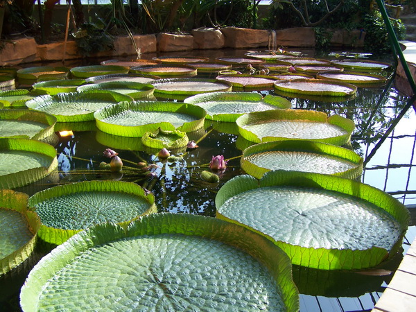 王莲(Victoria sp.)是睡莲科(Nymphaeaceae)王莲属(Victoria)的著名水上观赏植物,原产南美洲热带地区,在原产地是多年生的水生植物。在广州王莲有退冬休眠的现象,在温室栽培条件下,辅助光照及增温等措施,可使其冬季不退冬,保证了植株的充分生长。多年连续生长的王莲叶片更大、占据极大的水域面积,可达十数乃至几十平方米,非常壮观。娇艳的花朵在水面绽放,一株王莲即可形成异常美丽的生态水景,让人赞叹。