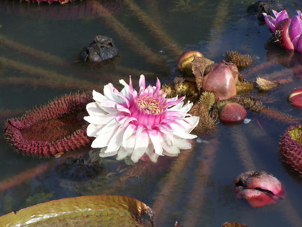 王莲是大型水生草本植物,叶基生,圆形,深绿色,叶边缘向上折起,形如硕大的圆形浅盘,成熟叶片平铺于水面,直径可达2m以上;叶柄粗长,具浅褐色尖皮刺,叶背紫红色,上面布满了隆起的网状叶脉,叶脉结构特别而坚固,使叶片具有巨大的承重力,据说最大的叶片可承载60kg重量;花单生于叶腋处,大而美丽,初开时花瓣白色,后转为粉红色,授粉后闭合沉入水中,种子在水中成熟,一年可多次开花,是优良的水景观赏植物。