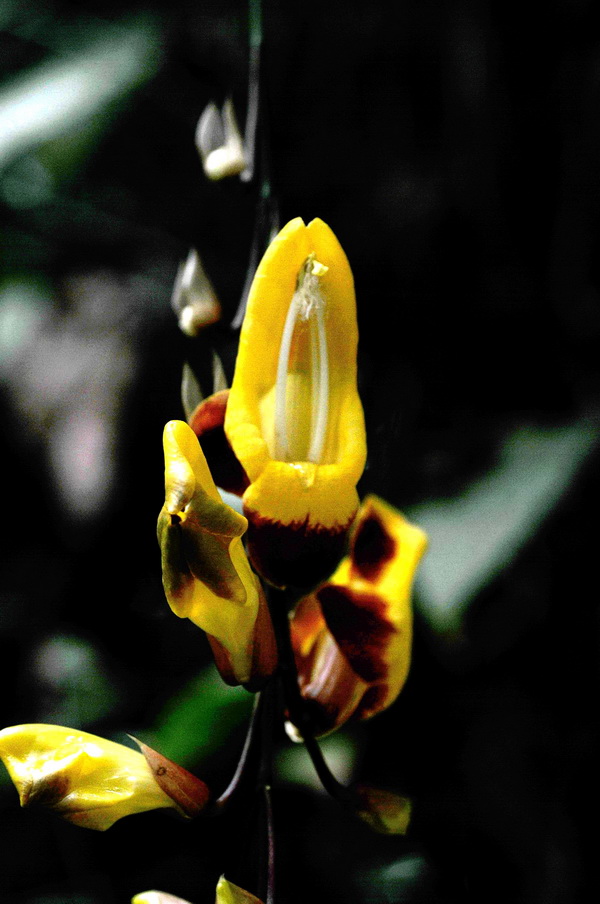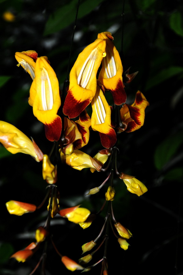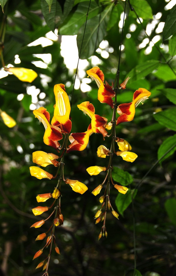 跳舞女郎(Thunbergia mysorensis),爵床科邓伯花属常绿藤本观花植物。总状花序,腋生,花序悬垂性,花萼2片,包覆1/3的花冠,花冠尖锄状,花冠内侧鲜黄色,外缘紫红色,连接成裙状,裂片反卷,宛如张开待食的鸦嘴,惟妙惟肖,所以又有一个通俗的名字“黄花老鸦嘴”。