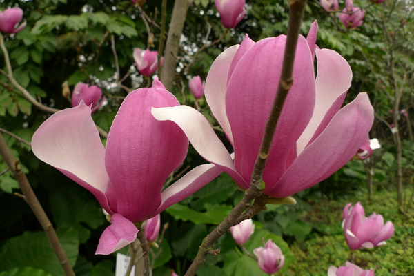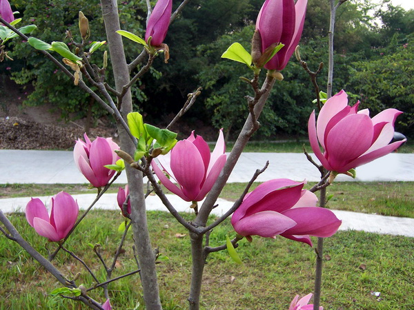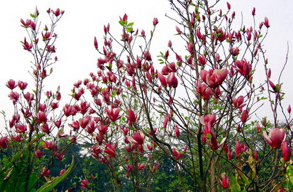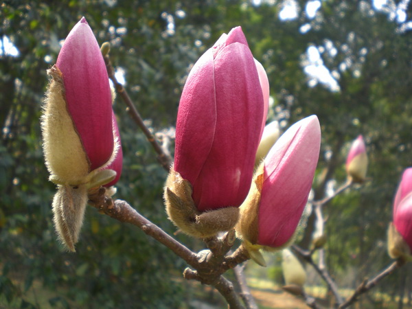 玉兰属植物是木兰科落叶乔木或灌木,其树形优美,花大艳丽,高贵典雅,芬芳袭人,有紫、深红、桃红、粉红、黄、奶黄、纯白、乳白等众多花色,深受国内外园林爱好者的青睐,作为珍贵的传统观赏花木,在园林应用中经久不衰。现木兰园里的玉兰、玉灯玉兰、望春玉兰、黄山玉兰、鹤山玉兰、二乔玉兰、红运二乔玉兰、阔瓣二乔玉兰、丹馨二乔玉兰和硃砂二乔玉兰等栽培种都在开花。花先于叶开放,满树含苞待放的花蕾,经一夜春风吹拂,花儿一下就竞相开放了,成了初春最早开放的花儿。