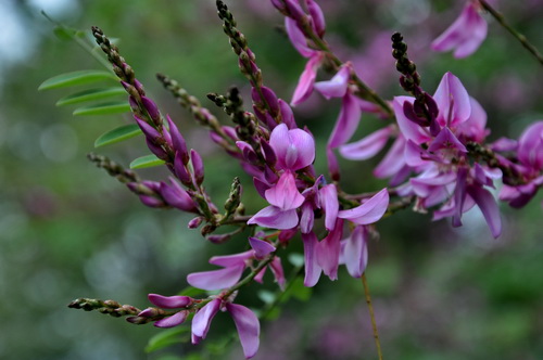 木蓝花(Indigofera sp.),属蝶形花科木蓝属,灌木,高1-2米,一回羽状复叶,小叶9—11对,长1.5—2.5厘米,宽1—1.5厘米,先端圆钝,具小尖头;总状花序,腋生,二体雄蕊,旗瓣外无毛,花紫色;荚果线形。花期3-5月,果期7-9月。