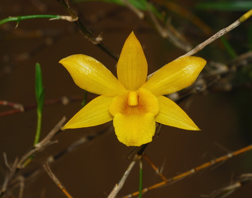 细叶石斛(Dendrobium hancockii Rolfe)为兰科多年生草本。茎直立,质地较硬,圆柱形,长15~80cm,直径3~10mm,具纵槽纹,上部多分枝,干后深黄色或橙黄色,有光泽,节间长2.5~4.7cm;叶通常3~6枚,互生于茎枝上部,线形,长3~8厘米,先端钝圆,微凹。总状花序腋生,具1~2朵花;花金黄色,蜡质,开展,仅唇瓣侧裂片内侧具少数红色条纹;唇瓣长宽相等,1~2厘米,基部具1个胼胝体,中部3裂;唇盘通常淡绿色,从两侧裂片之间到中裂片上密布短乳突状毛;花期5~6月。
