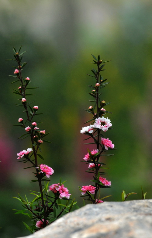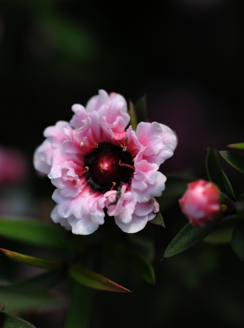 松红梅(Leptospermum scoparium)是近年来新引进的花卉品种之一,原产新西兰、澳大利亚等地区。因其叶似松叶、花似红梅而得名,又因其重瓣花朵形似牡丹,故也称:“松叶牡丹”。其花朵虽然不大,但花色艳丽、花形精美,盛开时满树的小花星星点点、明媚娇艳,吸引着人们的目光。