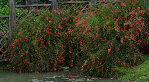 原来,此花名曰:炮仗竹(Russelia equisetiformis Schlecht et Cham.),乃舶来之物,自中美洲墨西哥漂洋过海来到中国,现在广东和福建等地有栽培。为玄参科(Scrophulariaceae)炮仗竹属直立灌木,别名:爆竹花、吉祥草等。株高1米左右,绿色枝茎纤细下垂,上面有纵棱。叶小,对生或轮生,已经退化成披针形的小鳞片,所以一般看不到叶片,形如“光棍树”。花儿鲜红,细小长筒状,小巧玲珑、曼妙可爱。盛开时长筒状的花朵成串的挂在下垂的枝条上,花色艳红,犹如细竹上挂满了红鞭炮,又像是圣诞树上那点点的彩灯。花期很长,几乎终年可以开放,尤其在夏季开得最为旺盛。此时的炮仗竹,那满身逼人的艳红如瀑布般垂下来,热烈得一塌糊涂,眼睛仿佛都要被点燃了,叫人不由得感叹:夏日不可无此君!