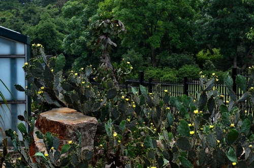 金武团扇仙人掌生长于热带地区,其性状强健,繁殖力强,生长速度很快,很容易蔓延开来。不过一般大多把它当作庭园植物栽培,可供观赏,可做绿篱,野外比较少看到它们的踪影,少数乡下荒地偶而会有零星生长。其株型适中,花大艳,可供观赏;浆果也可食用,“仙人掌冰”就是采集果实做成果酱,冰凉后再加入碎冰做成的。其实在家栽种一棵,开花时可观赏那大而鲜艳的花朵,结果后又可欣赏那鲜红欲滴的浆果,也可试着在家DIY那让人垂涎的“仙人掌冰”,只是可得注意那些坚硬的小刺,别被扎的满手是伤!