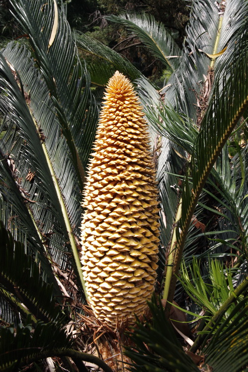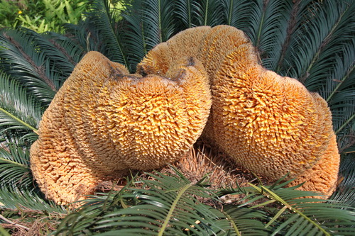 近日,华南植物园苏铁园内的各种铁树陆续开花了。可有一株铁树开出的花却特别奇怪,引来众多游客围观。此株铁树(Cycas revoluta)开的是雄花。铁树开的雄花正常为柱状,如玉米棒子一般。而这株铁树却开出皇冠状的花,形状奇特,而且花特别大,实属罕见。据初步判断,皇冠状的花是由3个雄球花并列生长而成。