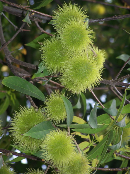 最近苏铁园有两棵大树上挂满了板栗状的球果,吸引路过的游客驻足观赏。粗心一点的人就把它当成板栗,也有人说是红毛丹。其实这种植物名叫猴欢喜,秋天果实成熟的时候,开裂的果荚掉在地上,果荚里面几颗褐色种子,不大,只有黄豆粒大小,有些发育不好的果荚还是空的,和板栗相差很大。