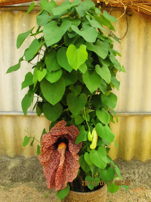 盛开的巨花马兜铃,其花型巨大,椭圆心形,花被褶折,紫红色、白色的斑纹交错,看起来色彩艳丽而又略显神秘,这些显著的特征,令其让人过目不忘。