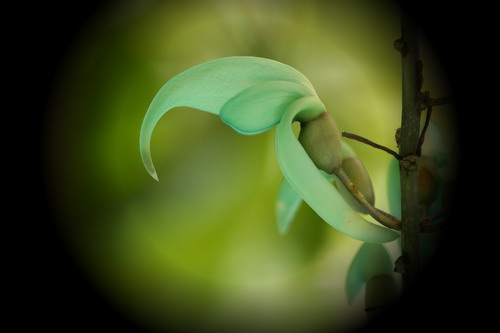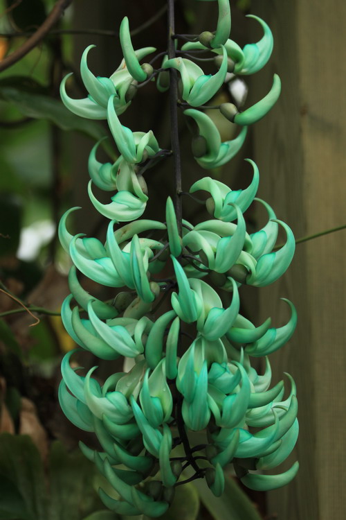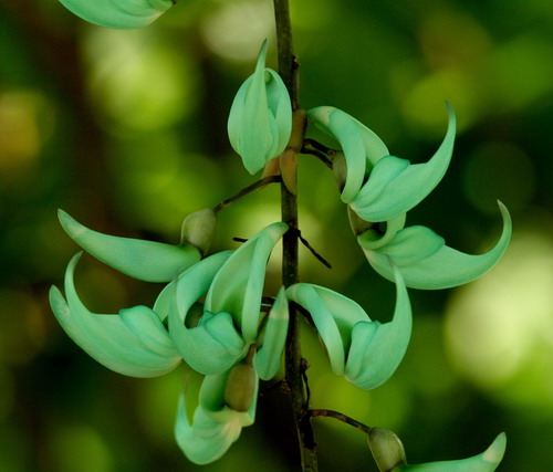 翡翠葛(Strongylodon macrobotrys A. Gray)又名碧玉藤,蝶形花科碧玉藤属木质藤本。花序悬垂,盛放时宛如一串串栖息于藤中林下的小鸟,生机盎然,惹人怜爱。花碧玉色透蓝色光泽,在阳光的照耀下,如翡翠般晶莹剔透,美得摄人心魄。含苞的酷似翡翠象牙,盛开的如同翡翠雕琢而成的金刚鹦鹉的喙,弯弯上翘的龙骨瓣甚张扬。