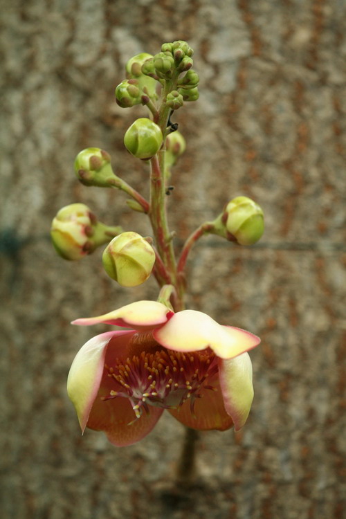 炮弹树(Couroupita guianensis Aubl.)为玉蕊科落叶大乔木,原产于南美洲圭亚那。株高达18-30m,叶簇生枝端,成螺旋状排列。干生花,5-8月盛放,总状花序悬垂;花艳丽,气味香醇,花瓣如浅碟状,内侧粉红或深红色,外侧淡黄色;聚生雄蕊极其特殊,二型,一种较长,一种较短,短的形如毛刷,长的状似海葵的触须。果实球形,茶褐色,直径15-20㎝,浑圆如生了锈的古代炮弹而得名。艳花硕果缠绕于干,甚是奇特,被视为珍奇的热带庭园树木。