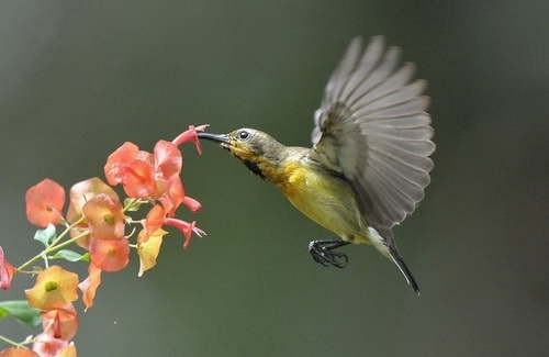 冬红(Holmskioldia sanguinea Retz.),马鞭草科(Verbenaceae)冬红属植物,常绿灌木,高3-7米;小枝四棱形,聚伞花序常2-6个,每聚伞花序有3花,中间的一朵花柄较两侧为长,花萼红色,由基部向上扩张成一阔倒圆锥形的碟,直径可达2厘米,边缘有稀疏睫毛,网状脉明显,甚为奇特;花冠红色,在枯黄的冬天里煞是惹人喜爱。花期:冬末春初。