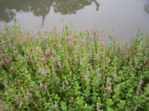 圆叶节节菜是广州池塘、水田边常见的湿地植物,生长快,顶生稠密的穗状花序,花色淡红,每年春季开花,成片开花时烂漫绯红,葱翠淡雅,别具风味。