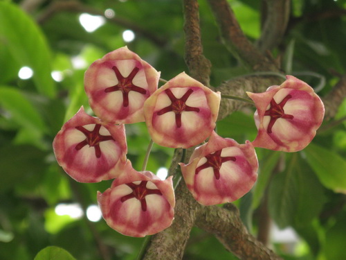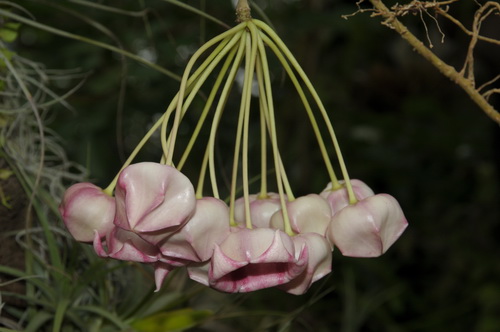 大花球兰原产巴布亚新几内亚,生性强健,适于攀附与吊挂栽培,攀援于树干、墙壁或绿篱上即可生长,每当开花时节,一串串浪漫的粉色“风铃”渐露芳颜,在风中轻轻摇曳,动感飘逸,明丽而可爱;也可盆栽置于南窗之下、走廊之间或书架之上,其枝叶凌空飘洒,让人悠然自得。