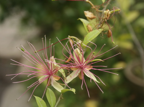 槌果藤(Capparis zeylanica Linn.),又名牛眼睛,白花菜科槌果藤属多年生攀援灌木。幼枝密被白色或褐色的星状毛。叶互生,革质,嫩时两面均被星状柔毛,老叶光滑,叶两侧有一对向下弯曲的褐色锐利短刺。花1-2朵生于叶腋之上,花梗与花萼均被红褐色星状短绒毛;花瓣白色或米白色,边缘有毛;雄蕊约30枚,雄蕊的花丝长而突出,集合成圆扇状,初时白色,后转为紫红色,似女士化妆时沾上蜜粉的粉扑。浆果球形,暗红色。花期3-4月。