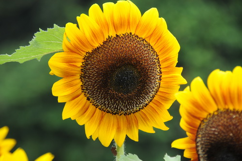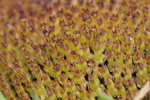 菊科出身的向日葵总是以一副大大咧咧的形象出现,这与其同门姐妹菊花高雅傲霜的品性相差甚远。其植株强壮,具粗硬的刚毛;其叶通常互生,心状卵形或卵圆形,边缘具粗锯齿,两面有糙毛,有长柄。巨大的花盘生于植株上端,花的结构十分别致,花盘上有两种花,即舌状花和管状花。舌状花1~3层,整齐地排列在花盘的周围,如轮似盖,为无性花。它的颜色和大小因品种而异,有橙黄、淡黄和紫红色,具有引诱昆虫前来采蜜授粉的作用。管状花,位于舌状花内侧,小而色暗,为两性花。花冠的颜色有黄、褐、暗紫色等,可结实,俗称葵花籽,可食用。