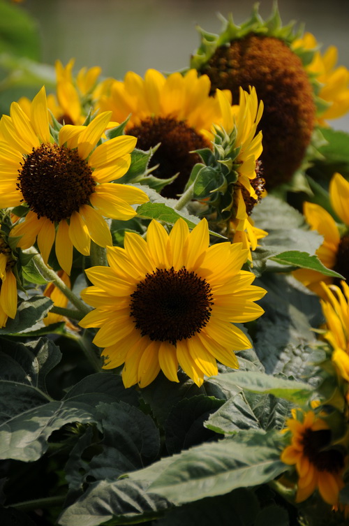 开心小矮人(Helianthus ‘Junior’):说它是小矮人,是指其株型矮小,每次布展都得把它摆在最前面。这是一个很好的盆栽向日葵品种,花朵为标准的向日葵样式:舌状花金黄色,管状花棕黑色;多头品种,顶生花直径12厘米左右,播种后30天左右现蕾,52天左右盛开,盛花期为15天左右,常做切花瓶插或者做成花束。