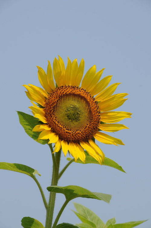绿波仙子(Helianthus ‘Procut yellowhite’):舌状花明黄色,管状花深黄色,给人以干净、明亮的感觉,花单生,直径约15厘米。株高在100厘米左右,适合庭院栽种,也可作鲜切花。开花较早,播种后30天左右现蕾,50天左右盛开,可持续开2周。