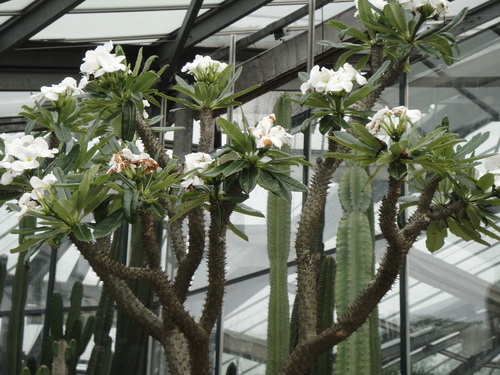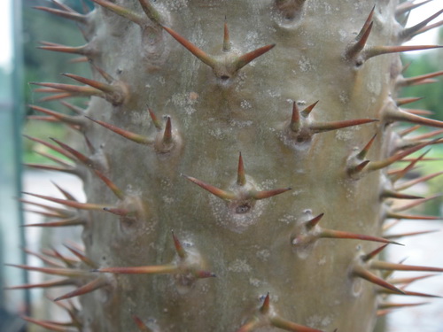 非洲霸王树(Pachypodium lamerei Drake.),是夹竹桃科(Apocynaceae)棒槌树属(Pachypodium)常绿多肉植物,原产非洲马达加斯加岛西南部。非洲霸王树褐绿色圆柱形,茎干肥大挺拔,最高可达6米,远远看起来像一个超大的棒槌,其属名就是由此而来;整个树霸气十足,有种傲视群雄的气势,树身通体密生3枚一簇的硬刺,它的3枚刺都是2枚短,1枚长,看来就像我们中国古代的一种兵器——狼牙棒;茎顶丛生线形叶片,翠绿色,叶柄及叶脉淡绿色;开白色的花,花期较长。