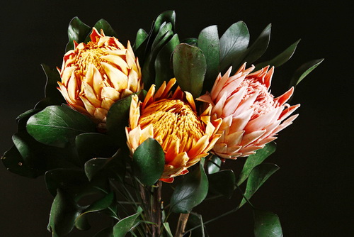说起帝王花,其实不是我们平常单指的一种花,而是指山龙眼科的一个亚科——普洛蒂亚家族(Protea)植物的统称。这个家族的植物颇为古老和原始,现仅分布在南半球的非洲、南美与澳洲。而帝王花(protea cynaroides),作为南非的国花,是普洛蒂亚家族中分布最广泛的品种之一,可以在海拔0米直至1500米高山上生长。不同的气候条件和地理环境会造就了帝王花树叶、花型、花色以及开花时间的巨大变化。这使得帝王花在作为鲜切花种植时能够适应全世界不同时节的市场需求。