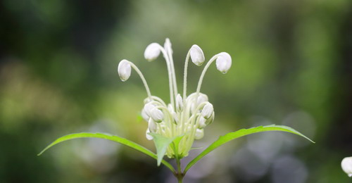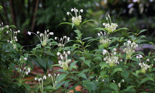 音符花(Clerodendrum incisum),马鞭草科大青属小灌木,植株高60-90厘米。叶对生,具柄,卵形或倒卵形或椭圆形,叶缘有粗齿。花期夏秋季,花序腋生,3~7朵;花冠白色,管柔弱,前瑞弯曲膨大,形如五线谱上的音符,裂片矩圆形。