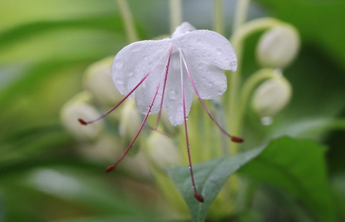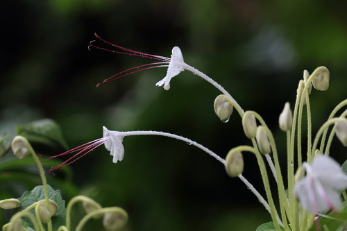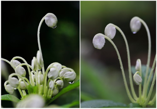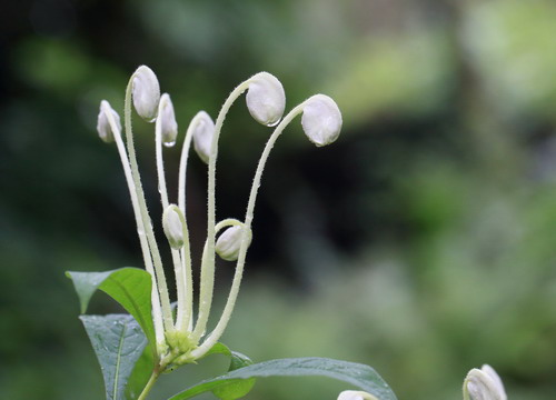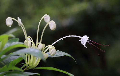得知华南植物园也有音符花,大前天去探访,看到花苞没长好,心里揣测过一天可能会开花了,以致惦记着花儿开没开一夜没睡好,也没心思听周董的新歌,昨天一早顶着风雨赶到,总算看到开放出如仙鹤般的音符花。巧的是,花朵有四枚雄蕊,加上雌蕊刚好是五条线,花瓣象张开翅膀的仙鹤,象五线谱的调号,所知道的花朵命名中,我觉得这个“音符花”是最为贴切巧妙了。