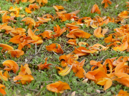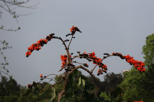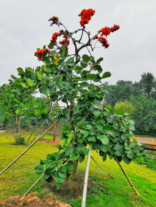 在华南植物园稀树草坪上,远远就看见高山植物室外靠湖边的草地上这株满树橙红色花的大树,走近前去,要仰视才能真切看清它的模样。
