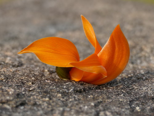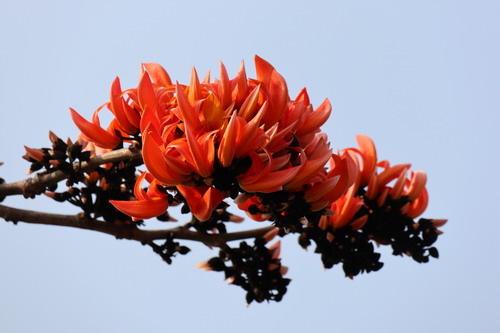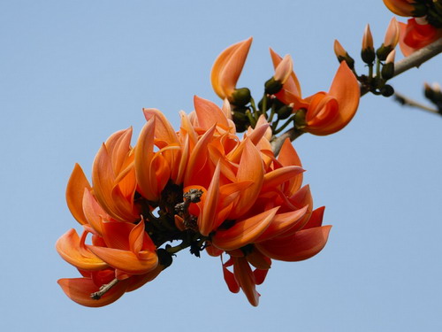 高高的树上,只见一只只黄橙橙的小鸟嬉戏于树枝上,仿佛正在举行一场大聚会,或者游园活动吧。紫矿的花具备着蝶形花亚科的所有特征。花萼钟状,花大,桔红色或橙黄。细看,花萼像小鸟的头部,翼瓣如张开的双翅,龙骨瓣似娇小的身躯,仿佛就是栩栩如生的小鸟嘛。