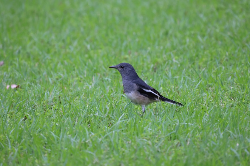 雌性鹊鸲(身体上半部为灰色)在草地觅食