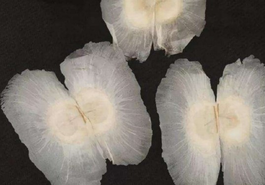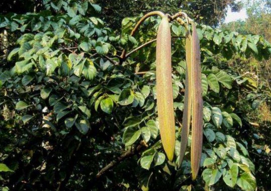 然后再来看看“木本的蝴蝶”。木蝴蝶(Oroxylum indicum (L.) Kurz)是紫葳科 (Bignoniaceae)木蝴蝶属的乔木,中文名称源于其种子具有半透明的膜质翅包围,很像轻盈灵动的蝴蝶而得名。它还有别名“千张纸、玉蝴蝶”等,每当果实成熟开裂,种子就如蝴蝶一般纷纷从果壳中飘落,颇为有趣。木蝴蝶不仅是一种可观花观果的园林绿化植物,还是一味传统的中药,《滇南本草》记载此物能“通行十二经络之气”;而《本草拾遗》则说木蝴蝶善疏解肝郁,有缓解“心气痛、肝气痛”的作用。