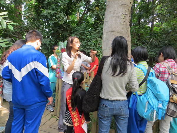 华南植物园的科普讲解员带领盲童们游览了温室群景区的热带雨林馆,亲历了奇幻的热带雨林之旅,在聆听讲解的同时他们用鼻子、耳朵和双手感触着热带雨林奇妙的植物。可以和那些在课堂上被描述了不知多少遍的神奇的花草树木亲密接触了,当那习惯了黑暗的一双双手触碰到潮湿的树根和娇嫩的花朵时,孩子们的脸上浮现出无比兴奋和欢快!他们感受到了植物世界的壮观和神奇:叉叶木的叶子像个“+”号;雄伟的板根像块大木板;锦屏藤的根不是深埋在土里而是飘荡在空气中;大家可以钻进“洞天树”的怀里,只要用手轻碰一下到手香的叶子便能带走浓浓的香味……孩子们还通过聆听大自然的风声、鸟声、瀑布声深深地体验到了人与自然的和谐感受。