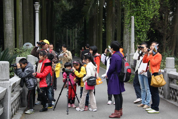 首先开展的是广受欢迎的华南植物园特色科普活动——野鸟观察,在资深观鸟导师、观鸟辅导员、飞羽志愿者的带领下,家长和孩子们组成四支小分队,搜寻鸟儿的倩影,聆听鸟儿的歌唱。在短短两个小时的时间里,大家收获颇丰,透过高倍望远镜,搔首弄姿的夜鹭、辛勤捕鱼的翠鸟伴侣、优雅舞蹈的蓝天舞者红嘴蓝鹊家族、高高在上的八哥朋友、唧唧咋咋的缝叶莺、鸣叫清脆的叉尾太阳鸟尽收眼底,家长和孩子大饱眼福,发出阵阵惊喜和赞叹。