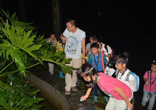 在夜观中,指导老师让同学们都近距离地观察这些昆虫们。通过让同学们用触摸的方式感受了斑腿泛树蛙跟饰纹姬蛙的区别,它们最主要的区别的就是腿,树蛙的脚趾上有吸盘,同学们都很积极地体验了斑腿泛树蛙的脚趾吸盘吸附在自己手上的感觉,并且亲眼见证了一回真正的“蛙泳”。夜间的“小灯笼”萤火虫让同学们跟家长们惊奇不已,大家今天才知道,原来这么弱小的萤火虫竟然是以蜗牛为食,并且这黑夜中的小精灵只有短短7天的寿命,孩子们都自发地感受到这短暂而顽强的小生命的不易。