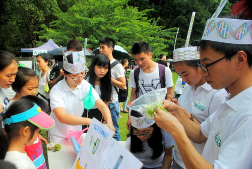 活动现场,IABG(国际植物园协会)办公室策划的用日常用品洗洁精、食盐和酒精提取植物DNA的科普项目,深受广大市民的喜爱。在广州的烈日和高温下,华南植物园基因工程中心李勇青教授带领她的三位“学霸”弟子,博士研究生蔡佳佳、 硕士研究生邵珠佳和马小玲,现场演示如何提取香蕉、火龙果和奇异果DNA,引来很多参加者的驻足和围观。