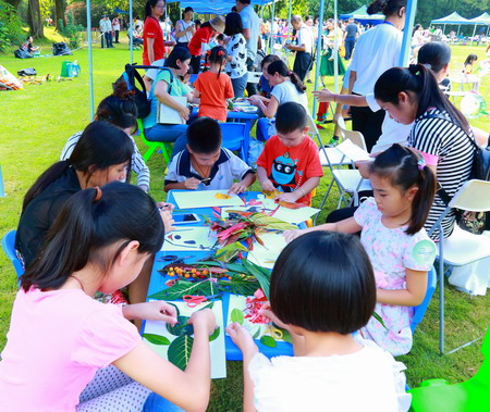 在互动创意区,精心设计的植物粘贴画互动体验活动让孩子们在轻松愉快的氛围中进行。植物粘贴画是借美术之灵,创自然之美,小朋友们充分发挥自己的创造和想象空间,让每一片树叶都充满着智慧,充满着生命力,孩子们和爸爸妈妈团结协作,发挥创意。他们做成各种各样的树叶粘贴画,并根据想象给树叶添上几笔,使画面更美。更重要的是,通过亲近自然的科普活动让孩子们懂得珍爱自然,保护环境,低碳生活,从我们做起。